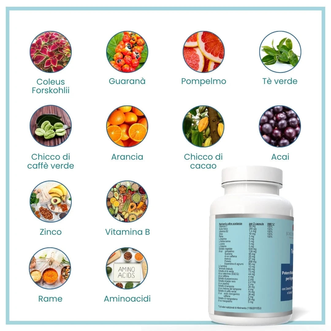 Składniki: Ekstrakt roślinny** 58% [ekstrakt z grejpfruta (Citrus paradisi, fructus), ekstrakt z nasion guarany (Paullinia eu pana), koncentrat soku pomarańczowego (Citrus sinensis, tructus), hesperydyna cytrusowa (Citrus), ekstrakt z pomelo (Citrus maxima fructus) bogaty we flawonoidy], hydroksypropylometyloceluloza (kapsułka), kwas L-askorbinowy, ekstrakt z zielonej kawy (Foffea arabica, semen), glukonian cynku, ekstrakt z zielonej herbaty (Camillia senesis, folium), organiczny proszek triphala (Terminalia chebula, fructus), ekstrakt z mangostanu (Garcinia mangostana, fructus sine pericarpo), ekstrakt z malin (Rubus idaeus fructus), winian L-karnityny, glukonian miedzi, zasada L-argininy, L-cysteina, L-fenyloalanina, Chlorowodorek L-lizyny, ekstrakt z kwiatu Sphae ranthus indicus, guma guar, ekstrakt z otrębów ryżowych (oryza sativa, brązowy ryż), ekstrakt z pieprzu czarnego (piper nigrum, fructus), ekstrakt z capsicum annuum (capsicum annuum, fructus), ryboflawina, kwas prepiroilomonoglutaminowy.